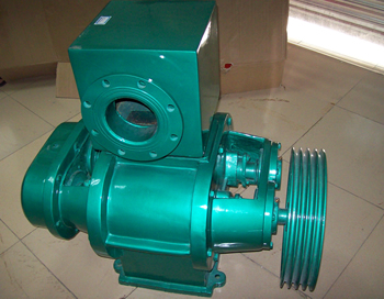 ????本机系由电机通过三角皮带轮带动主动转子转动,并通过同步齿轮带动从动齿轮驱动从动转子转动,两转子互不接触,且保持0.4mm左右的间隙量。转子与泵体及端盖间分别保持0.25mm左右的间隙量。运转过程中,在泵腔下部,由于两转子的不断分离,造成容积扩张,在上部由于两转子的不断接进造成容积的收缩,从而完成吸、排气体的作用,并在吸入侧造成真空,而排气侧与大气导通,接近大气压。泵体的出口有一消音箱,并同时具有稳定压力,密封作用,提高泵的工作效率。